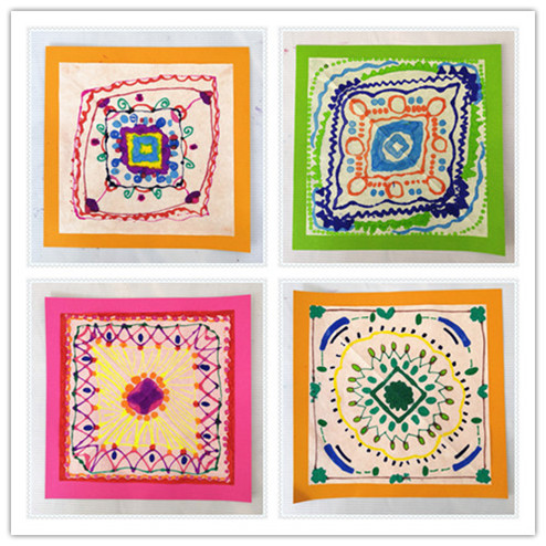 同学们在美术馆老师的指导下,先将宣纸对折再对折,用水彩颜料在宣纸上画上满意的图案,打开宣纸,原本的图案就对称地印在了上面。用这样的方法,同学们纷纷挑选了妈妈喜欢的颜色和图案,设计出了一款款漂亮的丝巾图案。