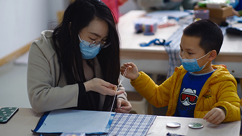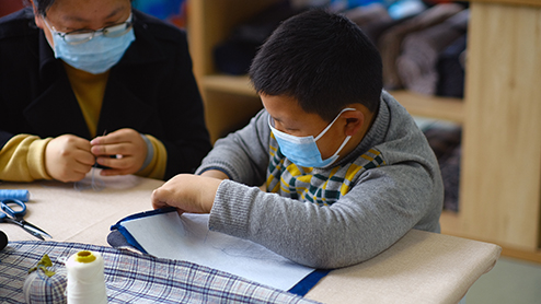为了能够让非遗进入到日常生活,布料晾晒完成后,老师还带领大家制作了桌垫。每一块桌垫的图案都各不相同,孩子们和家长一起,穿针引线,认真的制作,享受亲子时光。
