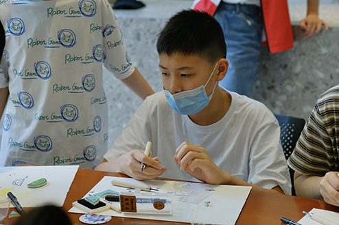 在版画体验活动中,陆老师给同学们介绍了制作版画所使用的工具,制作版画的步骤与注意事项,并演示了版画印刷的过程。为了方便初学者,我们这次准备了橡皮章让同学们体验刻印,橡皮章相比起木板材质更软,更容易进行雕刻。