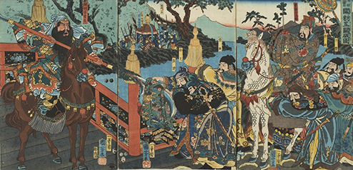 歌川国芳 关羽破五关图 三连续 木版画 35cm×24cm 1855 年