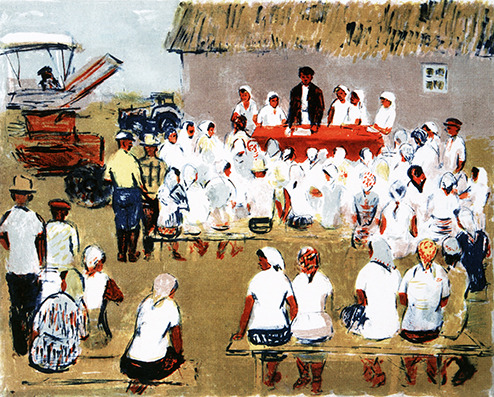 《集体农庄的平常日系列之农庄会议》玛斯列妮柯娃·И·Н 石版画 53cm×67cm 1981年